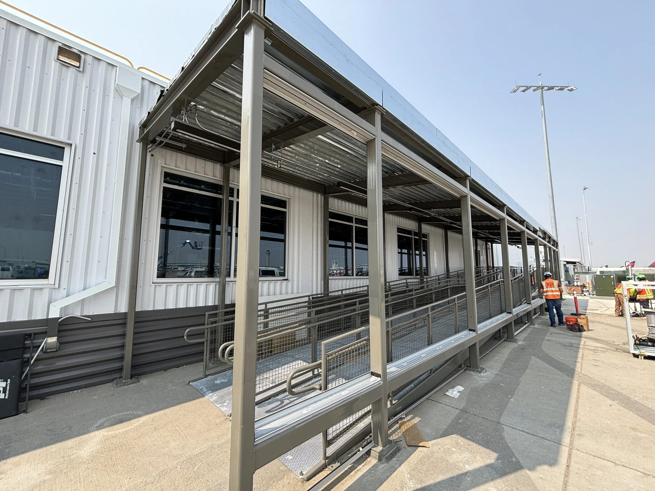 This package included interior fit-out of the new modular building, installation of toilet rooms, back-of-house utility and support spaces, new airline gates with queuing lanes, and addition of exterior double ramps and canopies at each new gate