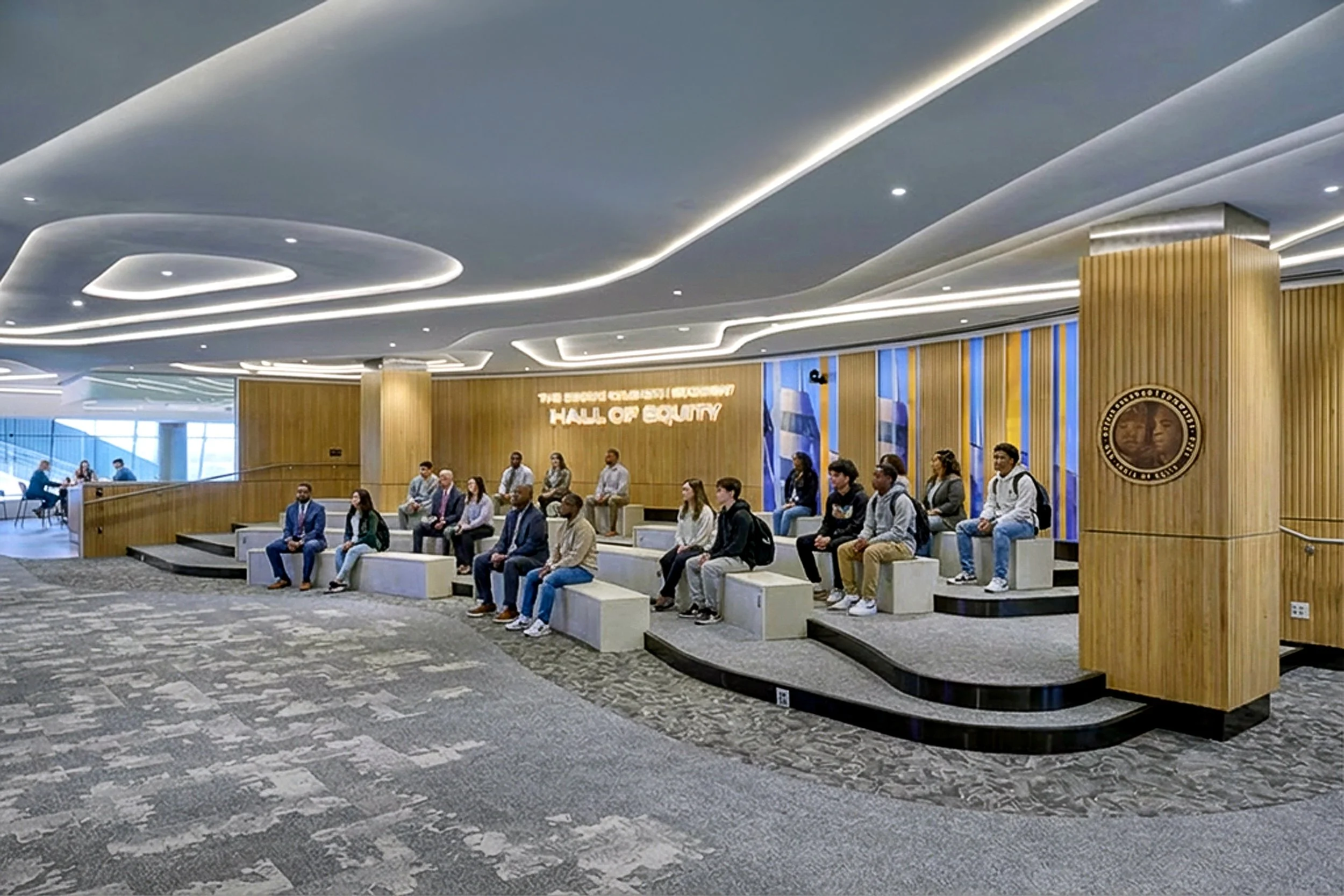 The hallmark of CEEA is the Hall of Equity, designed as the central event space with a curvilinear floor and ceiling pattern inspired by air flow. The space features a neutral color palette with warm materials, curved tiered seating for gatherings, lectures, and presentations, and opens into adjacent spaces for larger events, offering views of the commuter rail area below.